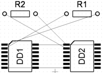 переместить R1 в точку 50 /45 – R2 в точку 30 /45 – DD1 в точку 30 /35 – DD2 в точку 50 /35 ;