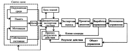 Рассмотрим структуру интеллектуальной системы (рис.2). На основании сведений об окружающей среде и собственном состоянии системы при наличии памяти и мотивации синтезируется цель, которая наряду с другими данными воспринимается динамической экспертной системой. Последняя с использованием базы знаний производит экспертную оценку, на основании которой принимается решение о действии и прогнозируются результаты действия (акцептор действия). В соответствии с принятым решением вырабатывается управление, т.е. синтезируется тот или иной алгоритм или закон управления, который реализуется с помощью различных исполнительных органов и воздействует непосредственно на объект управления. Результаты этого воздействия сравниваются с прогнозируемыми (механизм обратной связи, акцептор действия). При несоответствии результатов на базе новой экспертной оценки принимается решение, вырабатывается и реализуется управление, устраняющее это несоответствие. При соответствии результатов подкрепляется предшествующее управление. Если соответствие недостижимо, то уточняется цель. Данная структура инвариантна к объекту управления и носит универсальный характер.