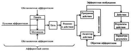 Афферентный синтез является исходным для построения любой целенаправленной деятельности. Четыре ведущих его компонента - исходная доминирующая мотивация, обстановочная и пусковая афферентация и, наконец, память позволяют представить механизм афферентного синтеза следующим образом: на основе исходной доминирующей мотивации, возникающей в результате той или иной внутренней потребности организма и памяти, организм, стимулируемый различными пусковыми сигналами, активно оценивает раздражители внешней среды, вырабатывает цель и принимает соответствующее решение к действию. В соответствии с целью все компоненты системы взаимодействуют так, чтобы выполнялась эфферентная программа действия. Аппарат акцептора результатов действия, формирующийся на основе определенной потребности, памяти, обстановки и специальных сигналов, заключает в себе все свойства будущего результата и поэтому служит для сопоставления предсказанного и реально полученного результатов. Обратная афферентация о параметрах результата есть не что иное, как обратная связь. Поэтому функциональная система Анохина является фундаментальным результатом, наиболее полно и просто объясняющим характер происходящих процессов. Норберт Винер в 1960 г. признал, что рассмотренный в плоскости физиологической кибернетики этот результат намного опередил рождение кибернетического направления в целом, а Гардон Паск в 1963 г. отметил, что, вероятно, наиболее ценная кибернетическая модель предложена П.К.Анохиным.