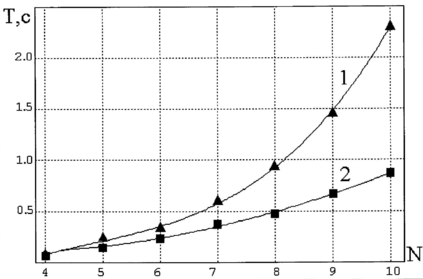 Рис. 42. Зависимость времени работы алгоритмов А1 (1) и А3 (2) от размеров графа сдваивания N, при p = N.