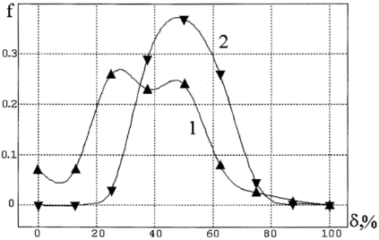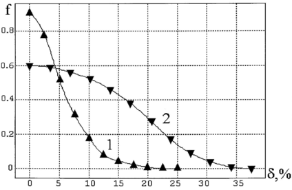 Рис. 43. Функция распределения f относительной погрешности алгоритма А1 при разрезании графа сдваивания с n = 15 на 1) p = 4; 2) p = 8 подграфов.