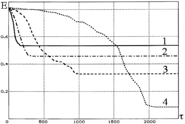 Рис. 45. Сходимость ошибки Е в методе Монте-Карло для различных значений начальной температуры J0: 1) J0 = 0.1; 2) J0 = 0.2; 3) J0 = 0.5; 4) J0 = 2.