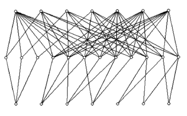 На рис.54 изображен граф такой вычислительной модели на одном временном шаге. Он имеет 26 вершин, распределенных по трем ярусам. Первый ярус составляют вершины, имеющие нулевой вес и определяющие рассылку компонентов вектора u с предыдущего временного шага. На втором ярусе располагаются вершины, соответствующие операциям по подсчету элементов тензора F. Данные вершины имеют веса (N3, N3, N3, 5N3, 3N3, 3N3, 5N3, 3N3, 5N3, 2N3, 2N3, 2N3), где N - число узлов сетки по каждому направлению. На третьем уровне находятся вершины, соответствующие операциям по пересчету вектора u по формулам (161). Их веса равны (3N3, 3N3, 3N3, 3N3, 2N3, 2N3, 2N3). Каждая из дуг графа обозначает пересылку одного трехмерного массива, поэтому вес всех дуг равен N слов, и если положить, что 1 слово = 4 байта, то вес дуг равен 64N Бт.