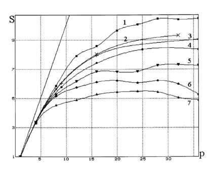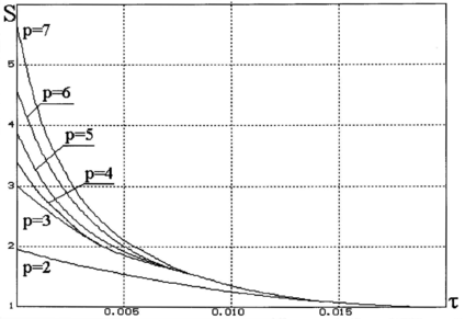 Рис. 55. Зависимость ускорения S, достигаемого при распараллеливании явного метода решения нелинейной динамической системы, от времени t передачи единицы информации по каналам ВС для разного числа процессоров p.