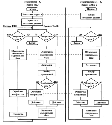 Для реализации ядра рассматриваемой системы предлагается программа, состоящая из задач двух типов - PRO и TASK, представленных на рис. 60. Задача PRO загружается в корневой транспьютер и поддерживает связь с загрузочным процессором для осуществления ввода-вывода данных (клавиатуры, экран, файлы, технологическое оборудование). Эта задача используется для передачи данных другим транспьютерам и задачам, а также для обобщения результатов работы задач второго типа. Задачи TASK загружаются во все транспьютеры и параллельно выполняются необходимые действия по обновлению базы, активации продукций и их применимости.