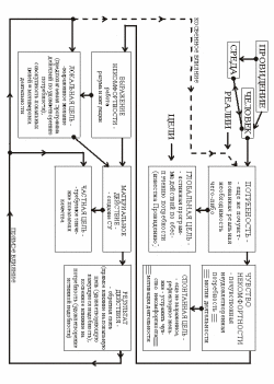 В п.1.1.2 цель определена как желаемый результат. Хотелось бы уточнить это определение с позиций возникновения (происхождения) и конструктивного содержания цели. Из [2]: цель - то, к чему стремятся (что надо осуществить); мотив - побудительная причина какого-нибудь действия; мотивировка - совокупность мотивов для обоснования чего-либо. Термин мотивация в [2] не разъясняется, но по смыслу употребления П.К.Анохиным его можно толковать как причину появления (у человека) совокупности мотивов... (оттенок предшествования в сравнении с термином мотивировка (- предъявление (человеком) совокупности мотивов...)). С учетом этого, рисунка 1, а также факта, состоящего в стремлении всего живого существовать комфортно (и как его естественного следствия - уходить от некомфортности, в частности, - устранением её причины), можно составить следующую диаграмму логики развития (последовательных этапов) процесса, сопровождающего возникновение и удовлетворение потребности, - диаграмму, раскрывающую один из механизмов формирования иерархии целей управления (см. через одну страницу, где во второй строке прямоугольников приведены реакции (в виде целей) на реально существующие материальные и психические процессы (реалии, приведенные в первой строке), являющиеся причинами возникновения целей).