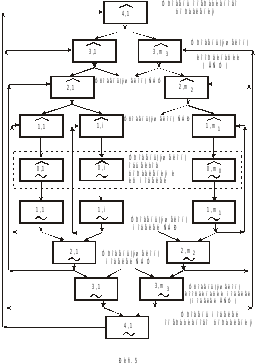 Поскольку каждой СУ, цели и тому подобное соответствуют их модели (на рис.4 представлена структурная схема модели САУ), существуют аналогичные рассмотренным иерархиям еще иерархии моделей, целей и т.п. В [4] приведена так называемая даймонд-структура (рис.5) (двойная (ромбовидная) структура), которая иллюстрирует структурную симметрию уровней реальных иерархических по глубине управления СУ (структурные элементы с домиком) и их моделей (структурные элементы с волной).