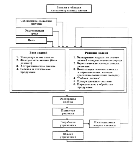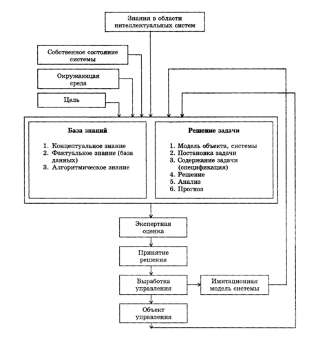 Здесь предполагается, что концептуальные и фактуальные знания точно отражают процессы и сведения, относящиеся к некоторой предметной области. Тогда решение задачи, возникающей в этой области, будет получено на основе строгих математических методов, в соответствии с постановкой и спецификацией. Результаты исследования решения и прогноз используются для получения экспертной оценки и принятия решения о необходимости управления. Затем на основе подходящего алгоритма управления, имеющегося в базе знаний, формируется управляющее воздействие. Эффективность и непротиворечивость этого воздействия, прежде чем оно поступит на объект управления, оценивается с помощью имитационной математической модели. Оценка должна выполняться быстрее реальных процессов в ИС.