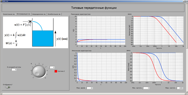 Меняя К с помощью ручки и анализируя получающиеся графики, сделать вывод о влиянии усиления на характеристики интегрирующего звена