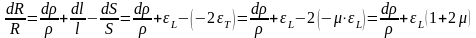 При описании выражения (4) использованы типичные для технической литературы обозначения для значений относительной продольной (longitudinal ) и относительной поперечной (traverse) деформации. В самом выражении (4) приведен связывающий эти деформации коэффициент Пуассона. Однако, при удлинении тела (положительное приращение длины) его сечение уменьшается (отрицательное приращение площади). Поэтому встает вопрос о знаке (плюс – минус) в выражении (4). Учтите это обстоятельство при выводе выражения (5).