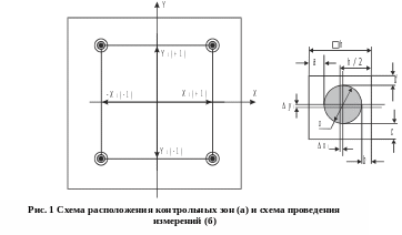 На плату наносится фоторезист и она совмещается с фотошаблоном. Проводится экспонирование и проявление фоторезиста. После этого с помощью измерительной трубки или микроскопа с окуляр - микрометром измеряются рассовмещения отверстий и контактных площадок в нескольких зонах на плате. Для облегчения последующей обработки результатов измерений контрольные зоны выбираются симметрично и ортогонально относительно центра платы (рис. 12, а)
