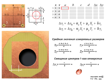 При сверлении отверстий, как и при изготовлении фотошаблонов, возможна также невоспроизводимость шага соответствующего механизма, приводящая к случайным смещениям xi, yi контролируемых элементов относительно их номинальных положений.
