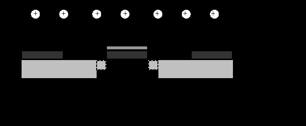 Основными материалами мишени при производстве ИС являются кремний и арсенид галлия, имплантируются фосфор, бор, мышьяк, сурьма и др., а в качестве материала маски используются алюминий, золото, платина, титан, диоксид кремния, нитрид кремния, фоторезисты. Ионная имплантация позволяет управлять дозами облучения от 1010 до 1018 ион/см2 и обеспечивает неоднородность распределения примеси на площади 320 см2 не более 1 - 2 %. С увеличением степени интеграции и рабочей частоты полупроводниковых приборов и ИС уменьшаются как горизонтальные, так и вертикальные размеры элементов. Например, толщина базы и эмиттера в активной области биполярного транзистора могут быть порядка 0,1 мкм, а геометрические размеры легированной области не превышают 1 – 2 мкм. При изготовлении полевых транзисторов ионной имплантацией получают самосовмещенный затвор (Рис.30), когда полностью совпадают границы областей «исток-затвор» и «сток-затвор», чего нельзя выполнить с помощью высокотемпературной диффузии.