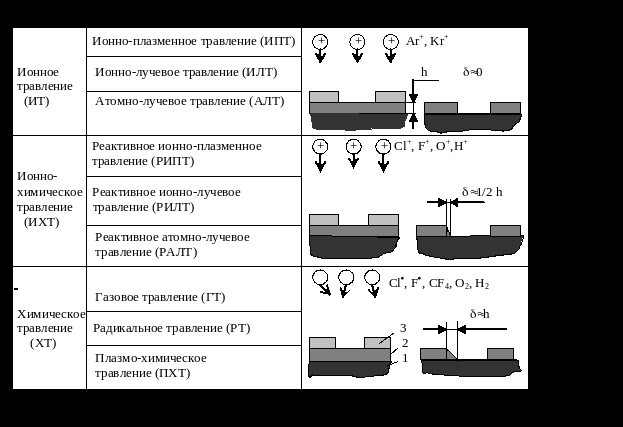 Выбор способа травления заключается в определении приоритетных характеристик: наименьшей селективностью травления и наименьшей погрешностью размеров обработки обладает ионное травление ("ИТ"); наибольшую скорость травления и наименьший нарушенный слой обрабатываемой поверхности можно получить при химическом травлении ("ХТ"); наилучшим сочетанием точности обработки и производительности оборудования обладает ионно-химическое травление ("ИХТ").