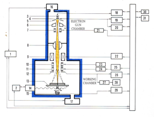 Для придания электронному пучку необходимой энергии (скорости) и формы служат формирующие и апертурные диафрагмы, фокусирующие и отклоняющие линзы, стигматоры, сканирующие системы и другие элементы ЭОС (на схеме справа).