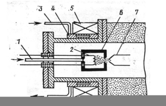 источниках ионов с горячим катодом (рис.2, где 1 – ввод газа; 2 – катод; 3 – ввод охлаждающей жидкости; 4 – держатель; 5 – электромагнит; 6 – разрядная камера; 7 – экстрактор) в качестве источника электронов используются катоды прямого накала или с косвенным подогревом. Эти источники бывают с экстракцией ионов вдоль оси разрядной камеры и коническим пучком (аксиальная экстракция) или перпендикулярно оси разрядной камеры через отверстие прямоугольной формы и пучком ионов в виде узкой ленты (радиальная экстракция). Основным достоинством таких источников является возможность получения высокоинтенсивных пучков ионов, а главным недостатком – быстрое разрушение термокатода при использовании химически активных рабочих газов.