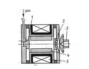 Автономные источники ионов с холодным катодом и разрядом Пеннинга (рис.3, где 1 – катод; 2 – антикатод; 3 – экстрактор; 4 – цилиндрический кольцевой анод; 5 – соленоид) содержат цилиндрический кольцевой анод, размещенный между параллельно расположенными катодом и антикатодом. Ионы вытягиваются из плазмы самостоятельного газового разряда через отверстие в антикатоде и ускоряются системой экстракции. Благодаря наличию соленоида источник обладает высокой эффективностью ионизации (до 1014 ион/см3), срок службы катода превышает 1000 часов. Недостатком такой конструкции является низкая сила тока пучка ионов (до 100 мкА), большая пульсация тока и возможность использования только газообразных рабочих веществ.