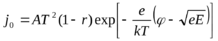 где A=120 А.см-2К-2 – константа Ричардсона; T - температура эмиттера, К; r - коэффициент отражения от потенциального барьера; e - заряд электрона; e - работа выхода электрона; k - постоянная Больцмана; E - напряженность электрического поля, В/м.