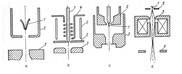 ис.1 Схемы электронных пушек: a – с термоэмиссионным катодом из вольфрамовой проволоки; b – типа Броерса с катодом из гексаборида лантана с косвенным подогревом; c – автоэмиссионный источник с электростатической фокусирующей системой; d – автоэмиссионный источник с магнитной линзой и двумя анодами; 1 – катод; 2 – управляющий электрод; 3 – анод; 4 – нить подогрева; 5 – экран; 6 – второй анод