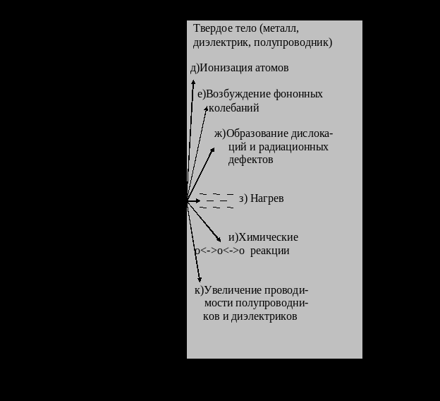 Эффекты, возникающие при взаимодействии электронного пучка с веществом (Рис.2), реализуются как дискретные события, сопровождающиеся ионизацией и возбуждением остаточных газов и паров (Рис.2 а), появлением вторичных электронов (Рис.2 б), возбуждением колебаний плотности плазмы, ионизацией на внутренних электронных оболочках, вызывающих рентгеновское излучение и эмиссию оже-электронов (Рис.2 б,в) и атомных частиц (Рис.2 г), рождением электронно-дырочных пар (Рис.2 д,к) с последующим световым излучением, переходным излучением и возбуждением упругих колебаний кристаллической решетки - возбуждением фононов (Рис.2 е), образованием дислокаций и радиационных дефектов (Рис.2 ж), нагревом (Рис.2 з) и химическими реакциями (Рис.2 и) и другими явлениями.