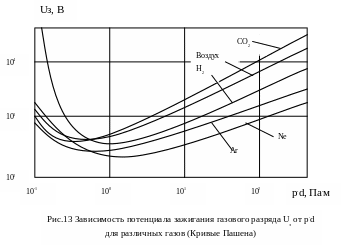 Напряжение зажигания самостоятельного газового разряда Uз зависит от рода газа и произведения давления p на расстояние между электродами d. Эта зависимость иллюстрируется кривыми Пашена (Рис.13).