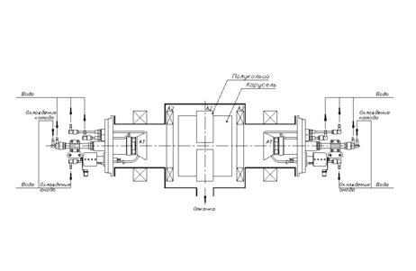 На установке реализован метод нанесения тонких пленок дуговым осаждением в вакууме. Сильноточный дуговой разряд (короткая вакуумная дуга) образуется между анодом А1 и холодным катодом К дугового источника. На установке установлены два дуговых источника, которые пристыкованы к вакуумной камере напротив друг друга. Анод А1 находится во внешнем магнитном поле, которое создает катушка, размещенная на анодном блоке. Катушка может перемещаться вдоль анодного блока. Таким образом, осуществляется стабилизация положения катодного пятна. Внутри вакуумной камеры размещаются дополнительные катушки А2, которые оказывают фокусирующее воздействие.