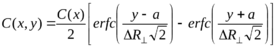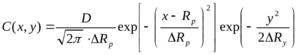 где x – координата, перпендикулярная поверхности мишени, м; y - координата, параллельная поверхности мишени, м; D – доза имплантации, ион/м2; Rp - средний квадратичный разброс глубины проникновения ионов (по координате «x »), м; Rp - математическое ожидание глубины проникновения ионов (проекционный пробег), м; Ry - средний квадратичный разброс пробега ионов по координате «y », м.