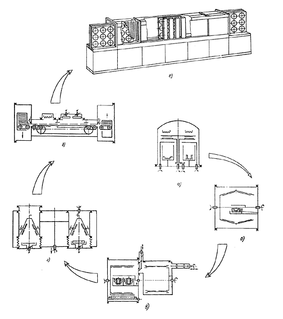 Рис.2 Спираль развития оборудования для нанесения тонких пленок в вакууме: установок периодического действия (а, б); с возвратным (в) и прямоточным (г, д) шлюзованием; вакуумных автоматических линий проходного типа (е)