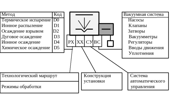 Известно, что машины различного технологического назначения состоят из следующих структурных элементов: механизмов и устройств рабочих РХ ходов (технологическая часть, отражающая виды и способы воздействия на обрабатываемое изделие) и холостых ХХ ходов (конструктивное исполнение, отражающее виды и способы загрузки, выгрузки, закрепления и перемещения изделий, размещения всех элементов машины), а также системы управления СУ. Спецификой вакуумного технологического оборудования, например для нанесения тонких пленок, является наличие вакуумной системы ВС (рис.1).