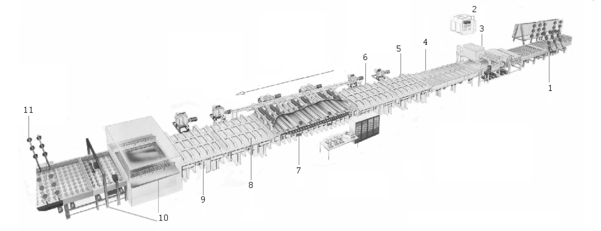 Рис.6 Вакуумная автоматическая линия нанесения тонкопленочных покрытий на стекла большого размера: 1 – участок загрузки; 2 – система подготовки средств очистки стекла; 3 – модуль очистки; 4 – входной роликовый конвейер; 5 – шлюзовая загрузочная камера; 6 и 8 – модули синхронизации скорости транспортирования изделия; 7 – рабочая камера с магнетронами; 9 - шлюзовая камера выгрузки изделий; 10 – участок контроля характеристик стекла с покрытием; 11 – участок выгрузки готовых изделий