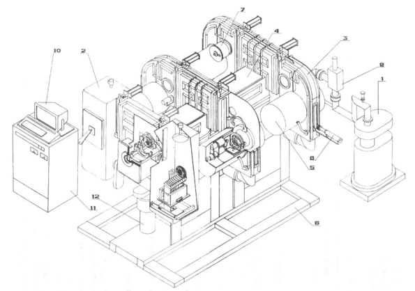 Рис.4. Внешний вид установки «Электроника ТМ-1203»: 1- форвакуумный насос; 2 -шлюзовое загрузочное устройство; 3 - рабочая камера; 4 - транспортная камера; 5 – магнетрон; 6 – основание; 7 - система быстрого термического отжига; 8 - устройство контроля; 9 – клапан; 10 - система управления; 11 - приборная стойка; 12 - высоковакуумный насос.