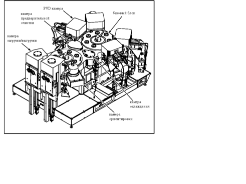 Рабочие камеры нанесения пленок снабжены магнетронными распылительными устройствами (МРУ) мультикатодного типа. МРУ содержит три катода с мишенью диаметром 100 мм. Вакуумная система установки собрана на базе криогенных насосов НВК-3.2А-Р. На установке реализуется технологический процесс нанесения четырехслойных пленок Тi - ТiN - Аl - ТiN в едином вакуумном цикле. Предварительно пластины диаметром 150 мм нагреваются до 573 К в камере очистки. Образование реактивной газовой среды для нанесения пленок ТiN осуществляется в течение 15 с. Неравномерность толщины слоев Тi и ТiN на пластинах составляет ±5%. Время нанесения каждого слоя составляет 15 - 30 с. Уровень привносимой дефектности обрабатываемых изделий составляет 0,15…0,25 шт/см2 с размером МДЧ 0,2 мкм и менее, что соответствует лучшим зарубежным достижениям.