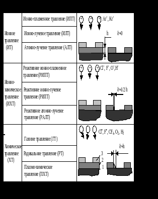 Наименьшей селективностью травления и наименьшей погрешностью размеров обработки обладает ионное травление ("ИТ"); наибольшую скорость травления и наименьший нарушенный слой обрабатываемой поверхности можно получить при химическом травлении ("ХТ"); наилучшим сочетанием точности обработки и производительности оборудования обладает ионно-химическое травление ("ИХТ").