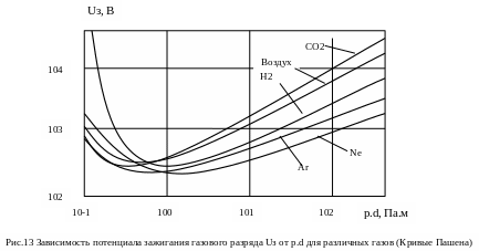 Напряжение зажигания самостоятельного газового разряда Uз зависит от рода газа и произведения давления p на расстояние между электродами d. Эта зависимость иллюстрируется кривыми Пашена