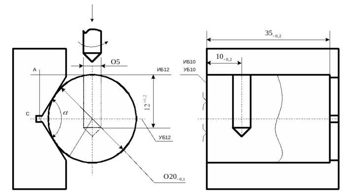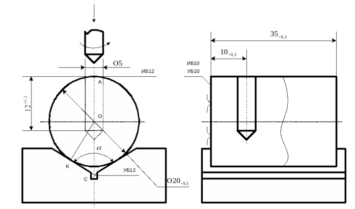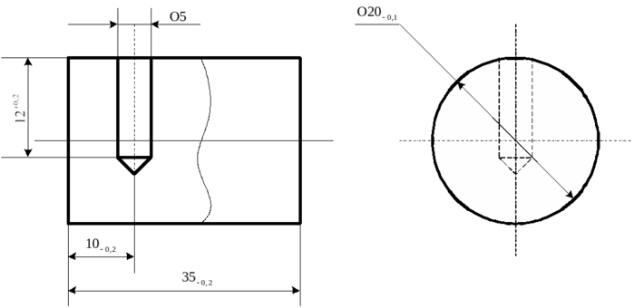 Получить отверстие 5 мм, выдержав размеры: 10-0,2 и 12+0,2