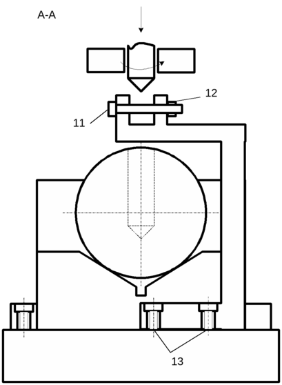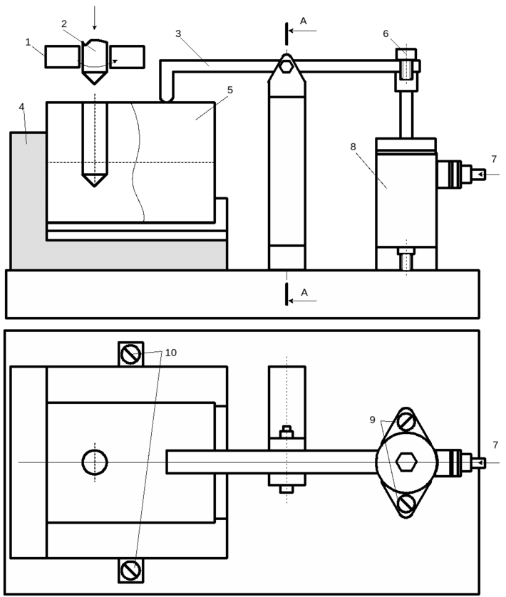 Подается воздух(7), в пневматическом приводе(8) под действием давления опускается поршень, сжимая пружину в приводе, приподнимается рычаг(3), рабочий кладет заготовку в приспособление(4), подача воздуха прекращается и поршень поднимается с помощью сжатой пружины, толкая рычаг, заготовка прижимается. Рычаг закреплен на оси(11). Затем через направляющую(1) подается сверло(2). После окончания сверления, сверло(2) поднимается, подается воздух(7) и заготовка отжимается, рабочий забирает готовое изделие и кладет новую заготовку и т.д.
