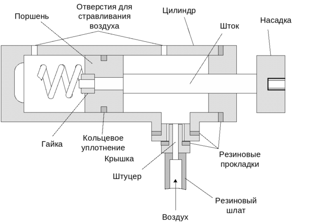 Выберем поршневой пневмопривод, в котором закрепление происходит с помощью пружины, а открепление – воздухом. В таком случае Pпр = W = 6 кН (расчет см. пункт б).