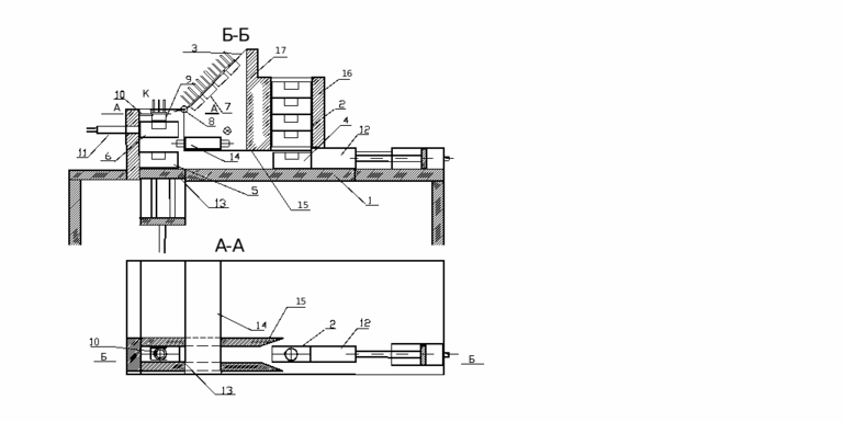 Перед началом работы радиаторы помещаются в кассету 2, транзисторы – на салазки 3. Ограничитель 8 не дает транзисторам выпадать из салазок. После того, как ограничитель отходит, работа начинается. Транзистор 7 выпадает из салазок 3 и попадает в положение 9, попадая при этом в призму базирования 10. После этого транзистор прижимается усилием F, чтобы он не смещался при сборке. Радиатор выпадает из кассеты 2 на стол 1, после чего сдвигается поршнем 12 до положения 5, движение происходит в пазе между бортами 15. Поршень 13 перемещается вверх с лежащим на нем радиатором и перемещается в положение сборки 6. После завершения сборки поршень 11 выталкивает собранное изделие на ленту-транспортер 14 (она движется в плоскости перпендикулярной плоскости рисунка в направлении от читателя), которая увозит изделие на место следующей операции.