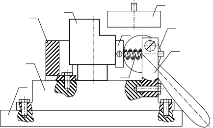 Заготовка (1) устанавливается на основание (4) и прижимается плитой (2) к призме (3), которая крепится двумя винтами к основанию. Эксцентрик (5), прижимающий плиту (2) прикреплен к блоку (6) с помощью болта. Пружинный механизм (7) обеспечивает свободное вынимание детали из приспособления зажима. Пружинный механизм соединяет плиту (2) и блок (6), и в центре каждой пружины вставлены специальные стержни (для направления плиты). Пружинный механизм соединяется с блоком с помощью двух винтов (завинчивающихся и в блок и в стержень). Блок (6) крепится к основанию (4) с помощью двух болтов. Основание (4) крепится с помощью четырёх болтов к рабочему столу (8).