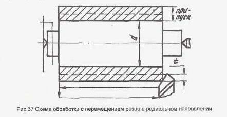 1. Обработка с перемещением резца в поперечном направлении.(имеет второе название – метод пробных ходов и промеров) Чтобы получить нужный диаметр d детали применяют метод пробных ходов и промеров. При этом резец подводят к вращающейся заготовке до соприкосновения с обрабатываемой поверхностью, фиксируя момент касания по появлению на заготовке едва заметной кольцевой риски. После этого резец отводят от заготовки продольным перемещением суппорта, затем поворотом рукоятки поперечного суппорта подают резец вперед, отсчитывая его перемещение по лимбу на величину тэ несколько меньшую, чем требуется для окончательного размера.