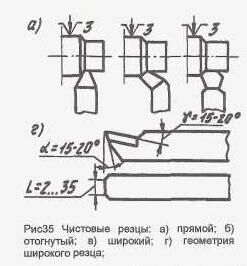 = 30 - 60°. Для обработки нежестких деталей применяют упорные проходные резцы (рис.34,в). Для черновых проходов применяют резцы с радиусом R = 0,5 -1 мм, а для чистовых R = 1,5-2 мм, так как чем больше радиус при вершине, тем чище обработанная поверхность. Для чистового точения целесообразно применять чистовые резцы (прямые или отогнутые) с радиусом закругления 3 - 5 мм (рис. 35,а и б)