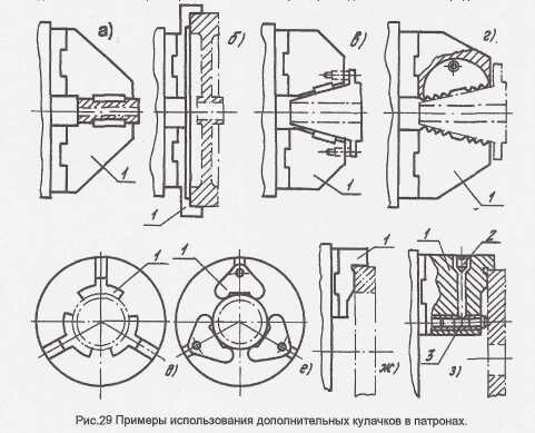 Примеры использования самоцентрирующих патронов с дополнительными кулачками приведены на рисунке рис.29. Дополнительные кулачки 1 для закрепления длинных и большого диаметра деталей показаны на рис.29,а,б. Возможно закрепление деталей за обратную коническую поверхность (рис.29,в), если угол уклона конуса превышает 4-6°. Если.на дополнительные кулачки нанести насечку, то закрепление деталей за необработанную поверхность может быть надежным и при большем угле наклона конуса. При необработанных конических поверхностях детали только один из трёх кулачков патрона может быть жёстким, а остальные два должны быть снабжены качающимеся губками (рис.29,г).