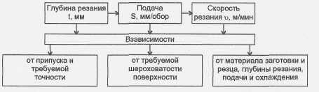Высокая производительность токарной обработки, точность и качество поверхностей достигаются правильным выбором режимов резания. Режимы резания выбирают в зависимости от материала заготовки и резца, от припуска на обработку, от требуемой точности и шероховатости поверхности детали, жесткости заготовки и резца применяемой СОЖ и других факторов. Последовательность выбора режимов резания может быть представлена следующей схемой.