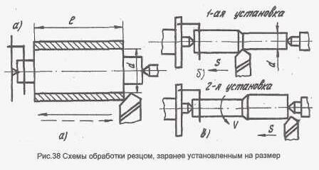 2. Обработка за один проход резцом, заранее установленным на размер (рис.38).(обработка на настроенном станке) В процессе обработки всей партии заготовок резец, установленный на размер d, не перемещается в поперечном направлении. После обтачивания детали на длине I её снимают, а резец отводят в исходное положение.(рис. а).