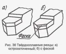 или широкие резцы (рис.35,в). Твердосплавные резцы для обработки хрупких материалов имеют острую кромку, а для обработки стали на кромке резца делают фаску (рис.36, а и б).