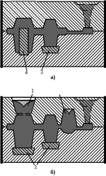 | Рис. 3.13. Предотвращение усадочных раковин и пористости с помощью: а – холодильников; б – прибылей и холодильников: 1 – верхняя открытая прибыль; 2 – боковая закрытая прибыль; 3 – внешний холодильник; 4 – внутренний холодильник | ||