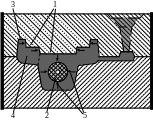 | Рис. 3.15. Схема возникновения усадочных напряжений в отливке корпуса: 1 – выступающие части формы; 2 – стержень; 3 – опорная ножка корпуса; 4 – утолщение опорной части корпуса; 5 – сжимающие усадочные напряжения |