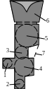 | Рис. 3.14. Наглядное представление тепловых узлов с помощью вписанных окружностей: 1, 2, 3, 4, 5 – тепловые узлы; 6 – прибыль; 7 – напуск | Для получения плотных отливок необходимо обеспечивать их последовательное затвердевание по всему объёму отливки без образования в ней замкнутых объёмов расплавленного металла. Тогда каждый следующий расплавленный объём будет питать застывающий предыдущий, а надёжное питание объёма металла, застывающего последним, можно гарантировать с помощью прибыли. Последовательность затвердевания тепловых узлов отливки можно наглядно представить путём сравнения размеров окружностей, вписанных в характерные объёмы отливки (рис. 3.14). В показанной отливке первыми будут застывать узлы 1 и 2, характеризуемые окружностями наименьших диаметров. После этого будет затвердевать узел 3. Затем начнёт застывать узел 4, а в последнюю очередь – самый большой по размеру узел 5. Образование усадочных дефектов в узле 5 можно предотвратить с помощью прибыли 6. Но узел 4 окажется отрезанным от расплавленного металла застывшим узлом 3, и появление в нём усадочных дефектов будет неизбежным. Для предотвращения появления этих дефектов с помощью напуска 7 следует сделать | |