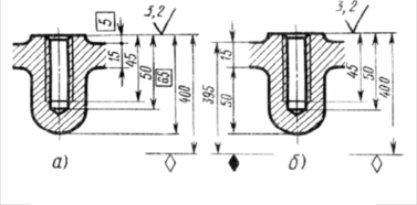 На виде г ошибка усугублена тем, что толщина верхней горизонтальной стенки (заданная в предыдущих случаях непосредственно размером 5 мм) определена высотой внутренней полости, заданной относительно обрабатываемой нижней плоскости (размер 185 мм). Таким образом, вводится еще один источник неточности. Толщина стенки будет колебаться в широких пределах.