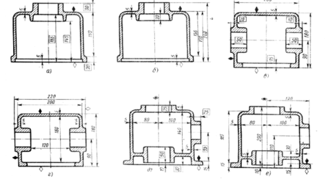 На виде е показана правильная система простановки размеров. В качестве черновой базы выбрана верхняя, необрабатываемая поверхность фланца. К ней размером 15 мм привязана база механической обработки (нижняя плоскость фланца). К базе механической обработки привязана обрабатываемая верхняя плоскость (размер 200 мм). Верхняя черная поверхность, координируется от литейной базы (размер 175 мм) и от нее – толщина верхней стенки (размер 5 мм).